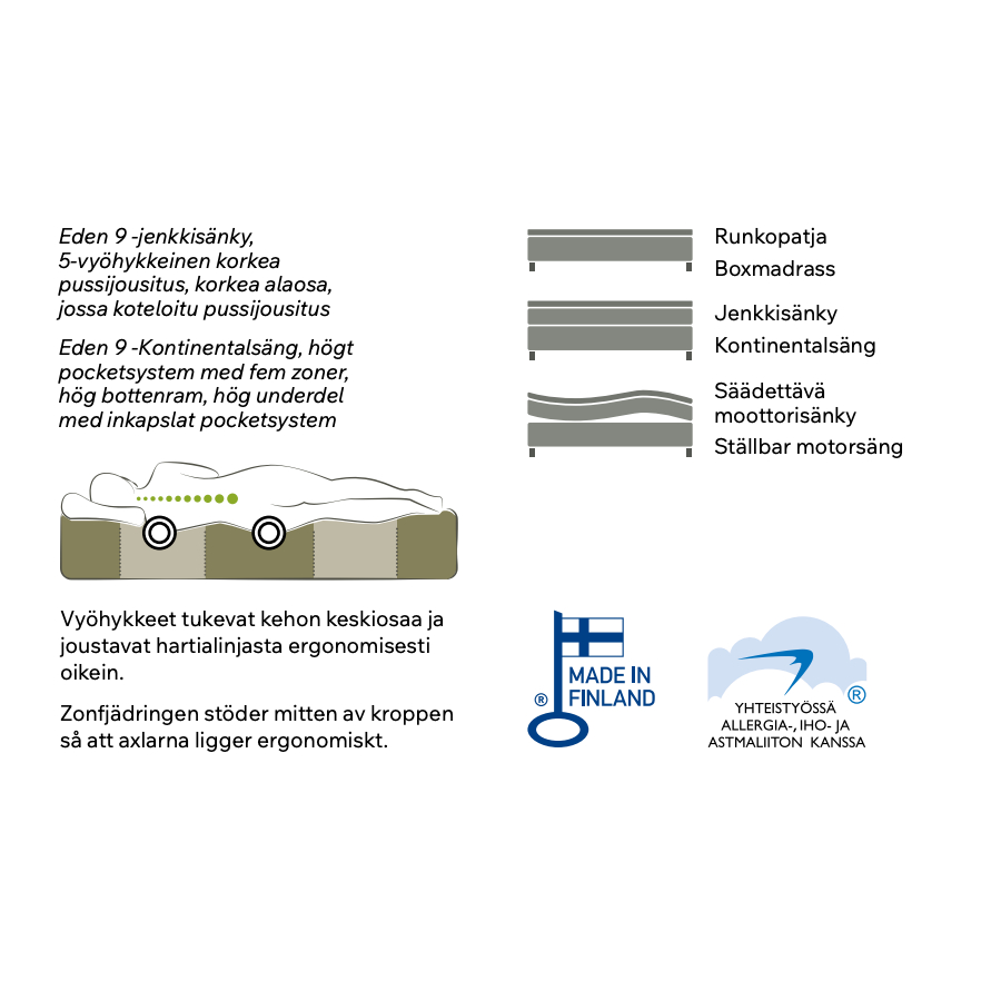 Jenkkisänky Eden 9:n ylemmässä patjassa on koteloitu, 5-vyöhykkeinen pussijousitus. Patjassa on malliston korkein jousikorkeus. Jousitus ja vyöhykerakenne tukevat sekä myötäilevät vartaloa optimaalisesti. Ylellistä mukavuutta ja pehmeyttä lisää runko-osan koteloitu ja pussijousitettu patja. Eden 9 -malliin on saatavilla lisäksi kaksi ylellistä, samettimaista lisäkangasta, väreinä Sammal ja Okra.