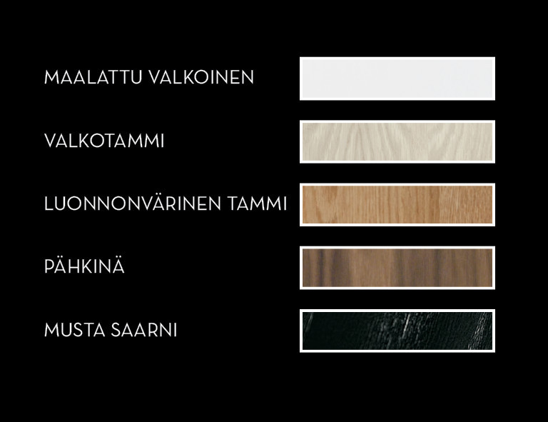 Värivaihtoehdot: maalattu valkoinen, valkotammi, luonnonvärinen tammi, pähkinä ja musta saarni.