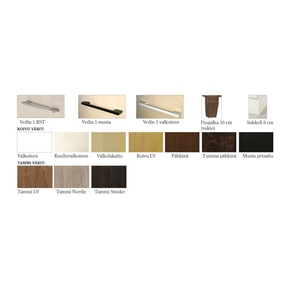 Koivu värit: Valkoinen, Kuultovalkoinen, Valkolakattu, Koivu lv, Pähkinä, Tumma pähkinä ja Musta petsattu.