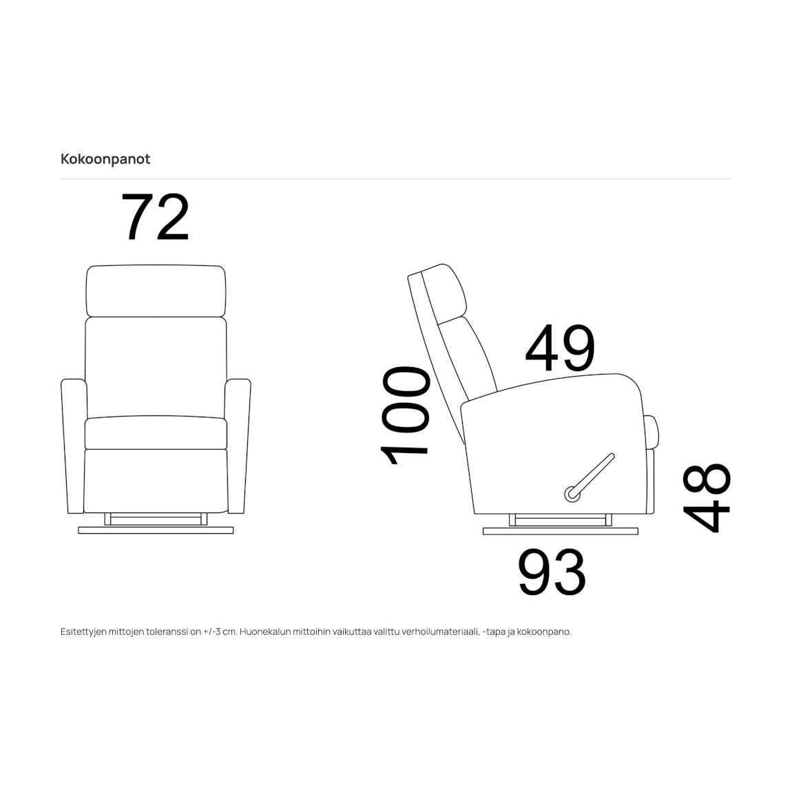 Istuinkorkeus 48 cm, istuinsyvyys 49 cm