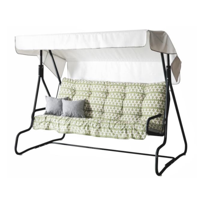 Korkeaselkänojainen 3-h istuttava De Grande pihakeinu, jonka harmaaksi pulverimaalattu teräsputkirunko on esikäsitelty Bonderite® NT:llä.