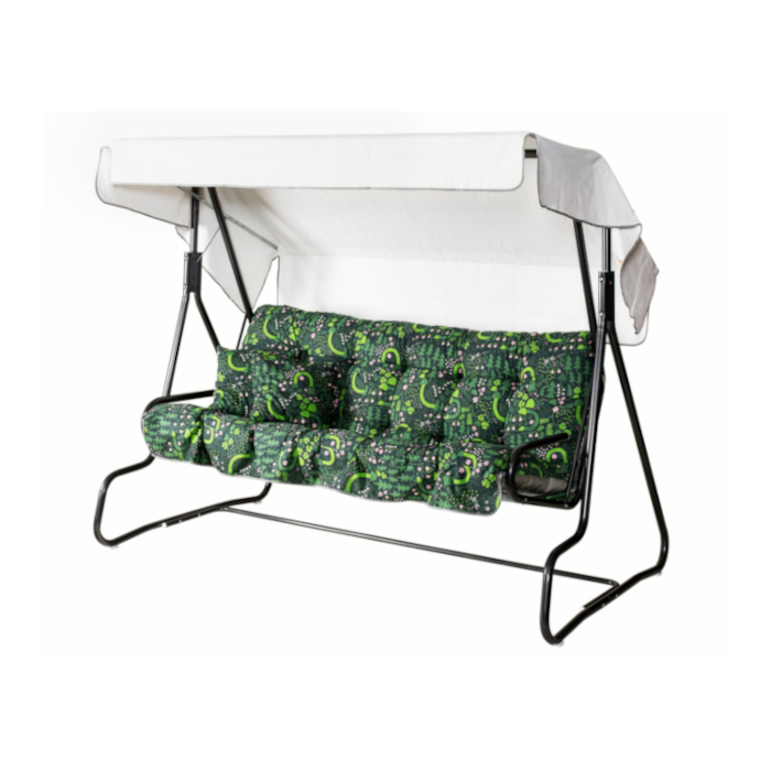 Pehmusteiden mitat: Istuinpatja 160 x 50 cm, selkänojapatja 160 x 70 cm. Tuotepakkaukseen kuuluu lisäksi kaksi käsinojatyynyä ja valkoinen katos.
